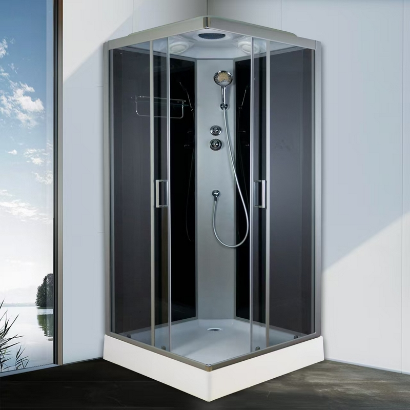 Низкий поддон (материал - акрил/ABS, толщина 3,7мм) Укрепляющая основа-100% смола и стекловолокно Закаленное стекло (травмобезопасное) Передние стекла и двери - тонированные - 4мм Задние стекла - черного цвета - 4мм Профиль усиленный, алюминиевый, серого цвета !НОВАЯ БЫСТРАЯ СБОРКА! 1. Тропический душ 2. Ручной душ, шланг ПВХ 3. Смеситель холодной/горячей воды 4. Переключатель режимов 5. Пластиковая колонна серого цвета
