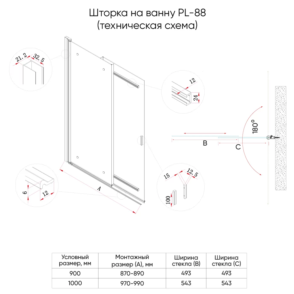 ----Шторка на ванну Veconi Palau PL-88B 900x1400 черный стекло прозрачное PL88B-90-01-C9