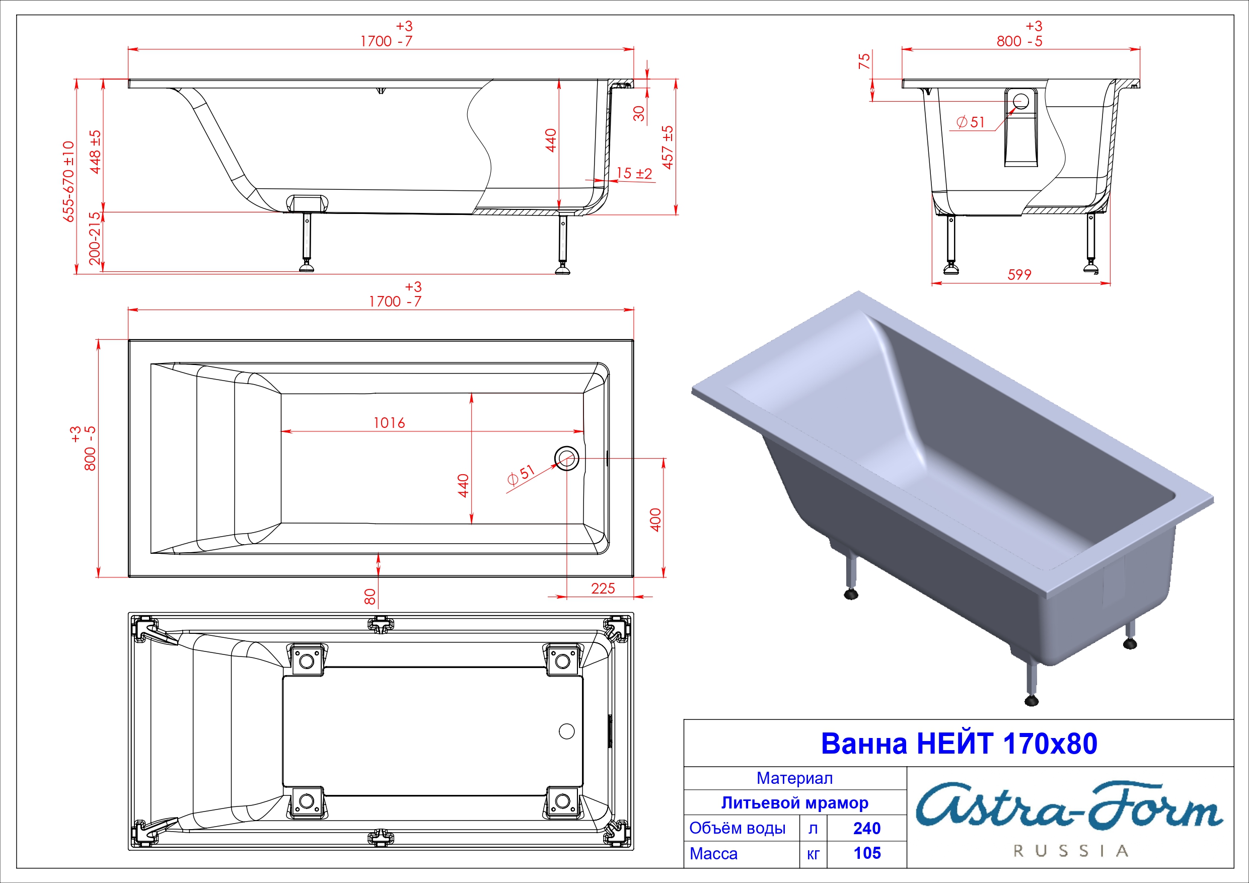 -----Ванна из литьевого мрамора Astra-Form Нейт (1700х800) с ножками