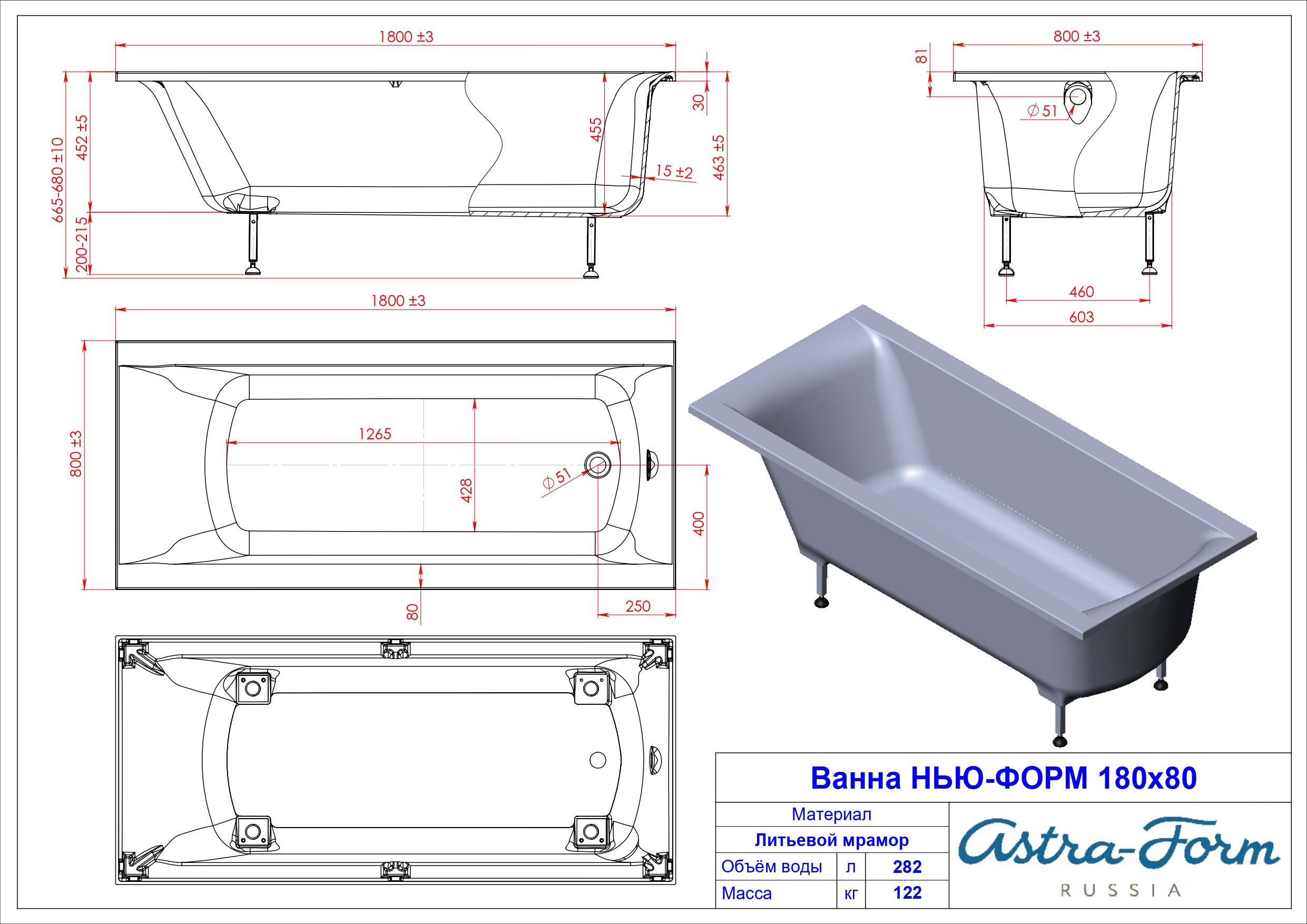 Ванна из литьевого мрамора Astra-Form Нью-Форм (1800х800) с ножками