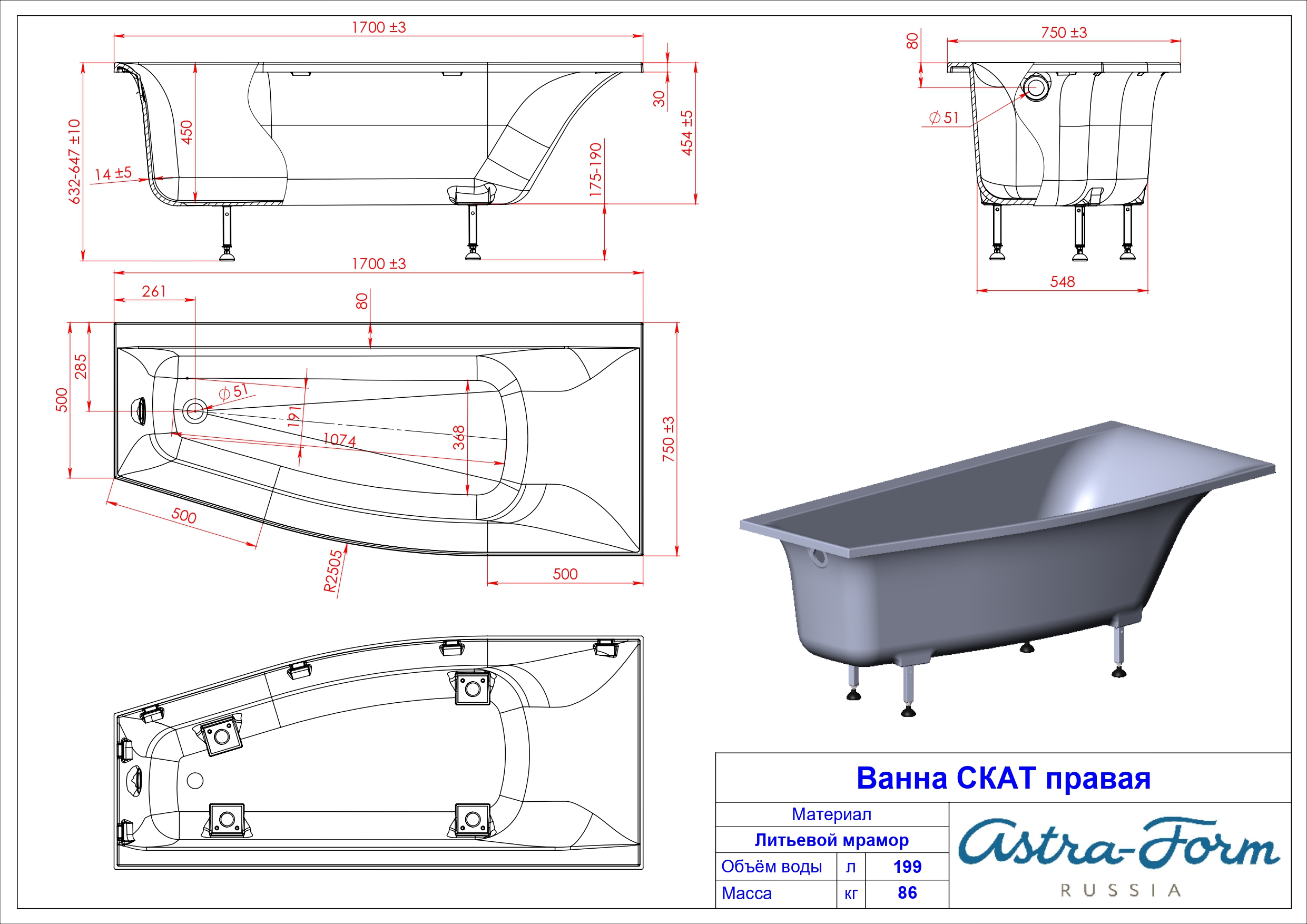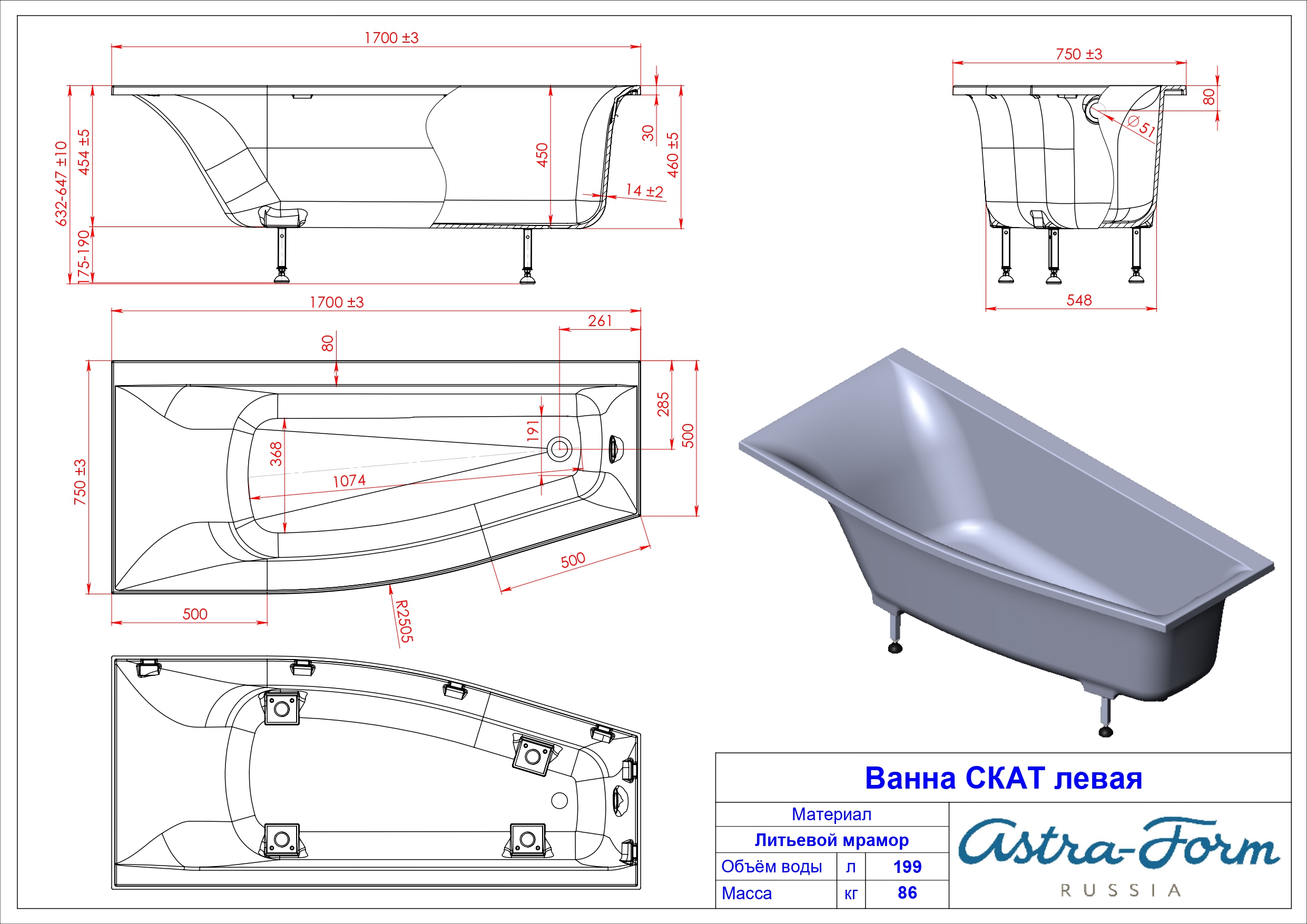 -----Ванна из литьевого мрамора Astra-Form Скат, левая/правая (1700х750) с ножками
