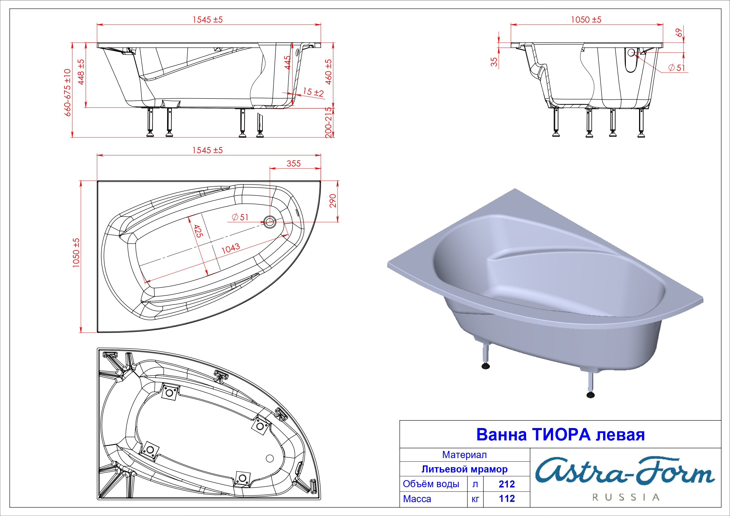 Ванна из литьевого мрамора Astra-Form Тиора, левая/правая (1545х1050) с ножками