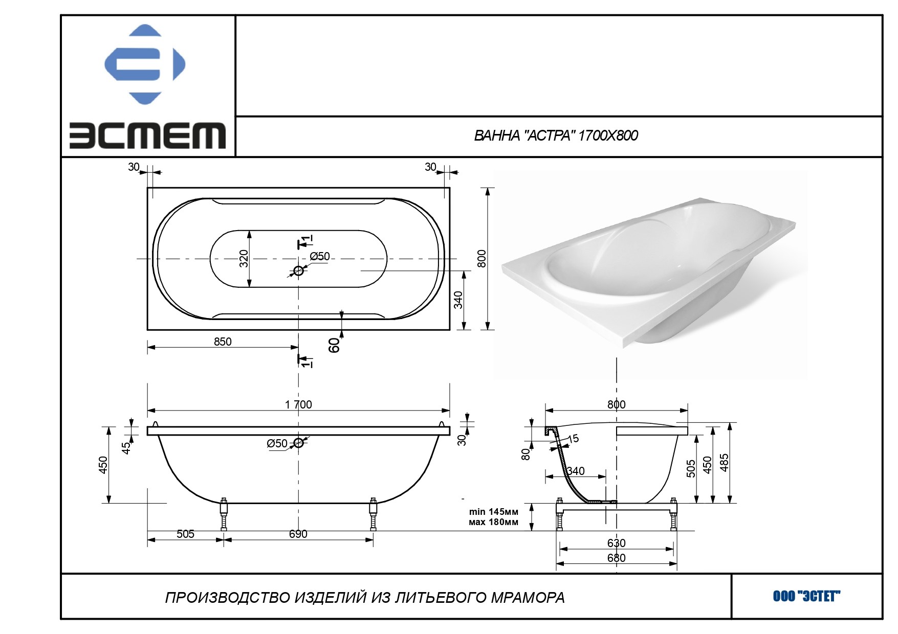 Ванна из литьевого мрамора Эстет Астра (1700*800*450)