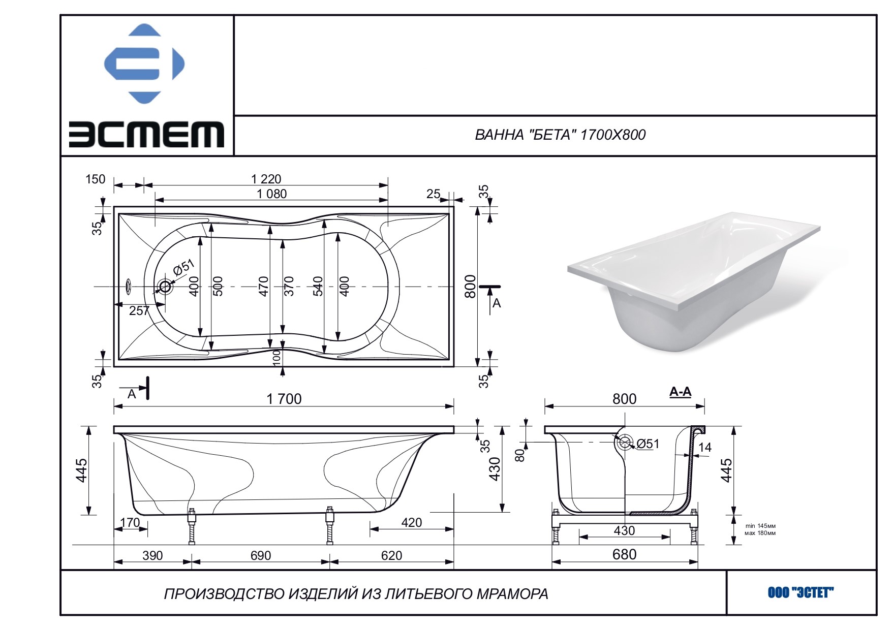 -----Ванна из литьевого мрамора Эстет Бета (1700*800*440), ножки