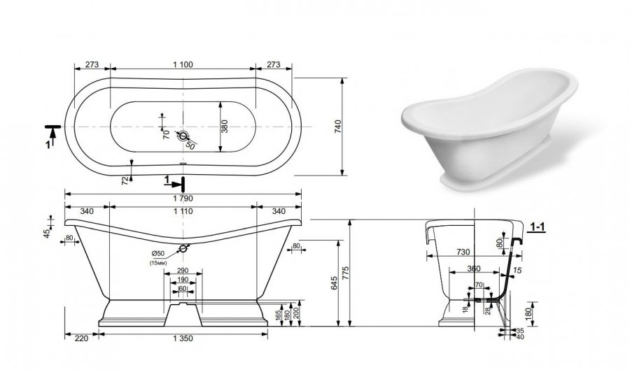Ванна из литьевого мрамора Эстет Бостон (без ножек) (1800*740*460)