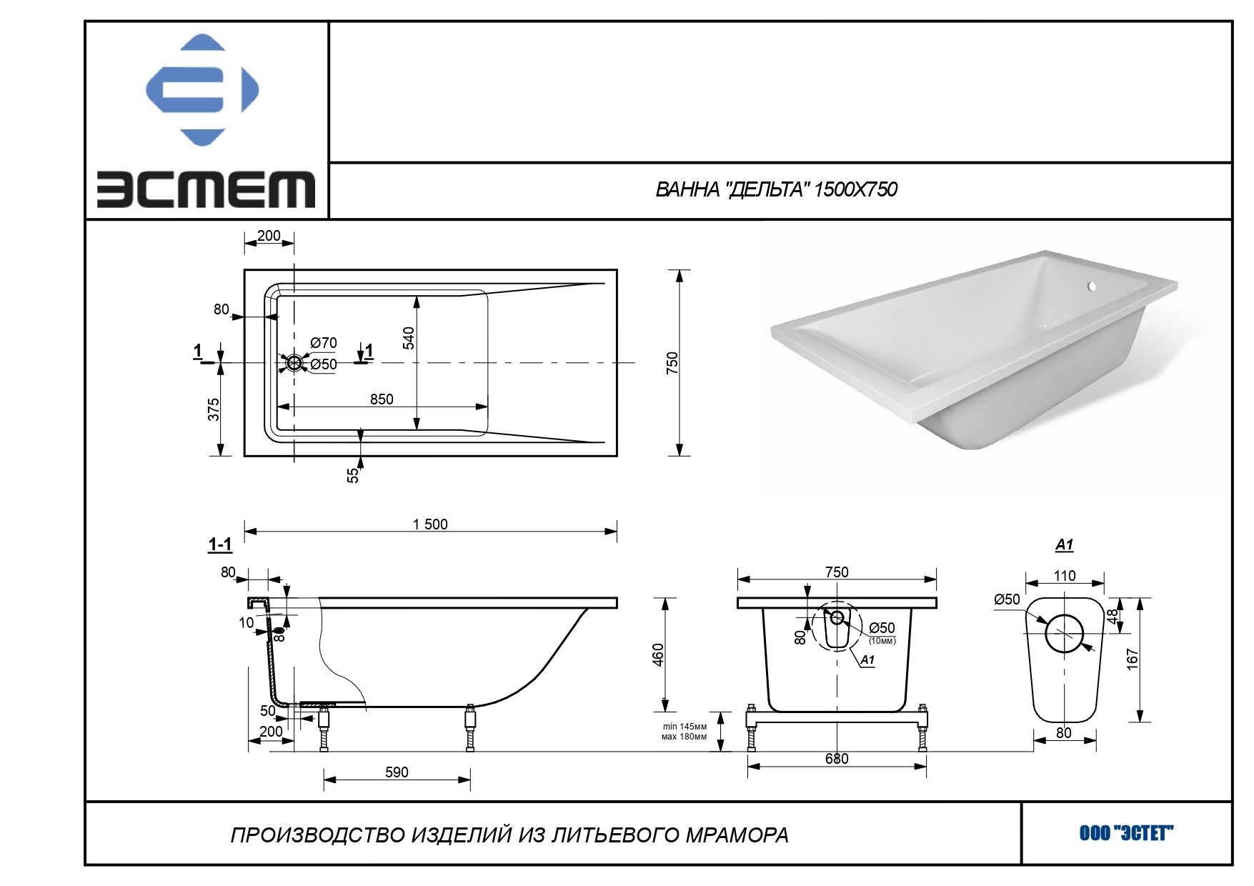 -----Ванна из литьевого мрамора Эстет Дельта (1500х750х460), без ножек