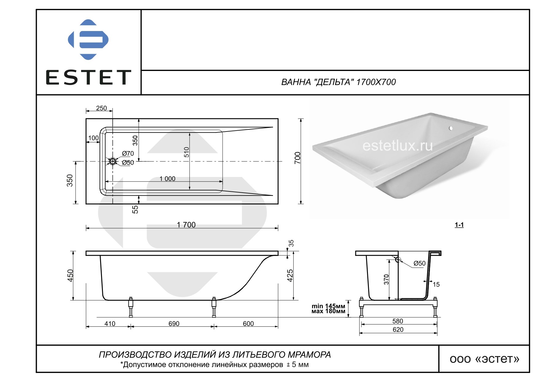 -----Ванна из литьевого мрамора Эстет Дельта (1700*700*460) без ножек