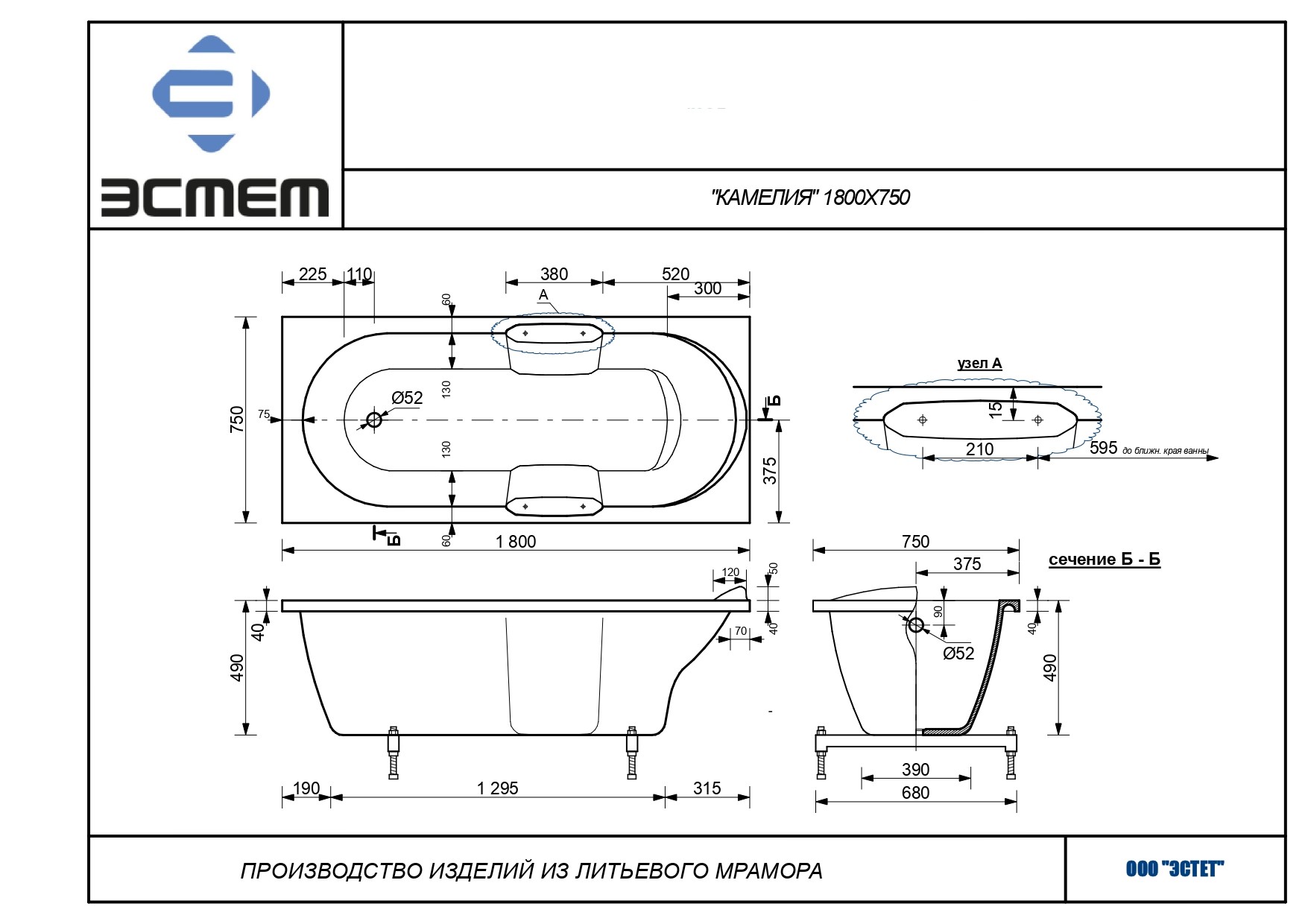 -----Ванна из литьевого мрамора Эстет Камелия (1800*750*490) без ножек, (без ручек)