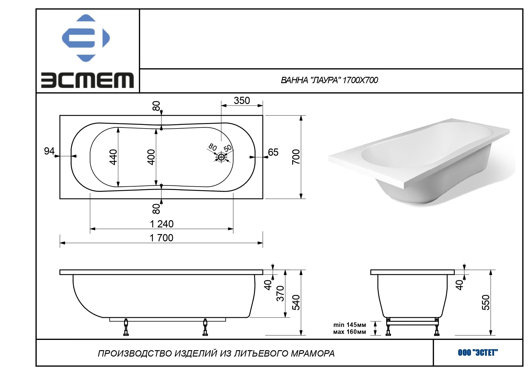 Ванна из литьевого мрамора Эстет Лаура (1700*700*370), без ножек